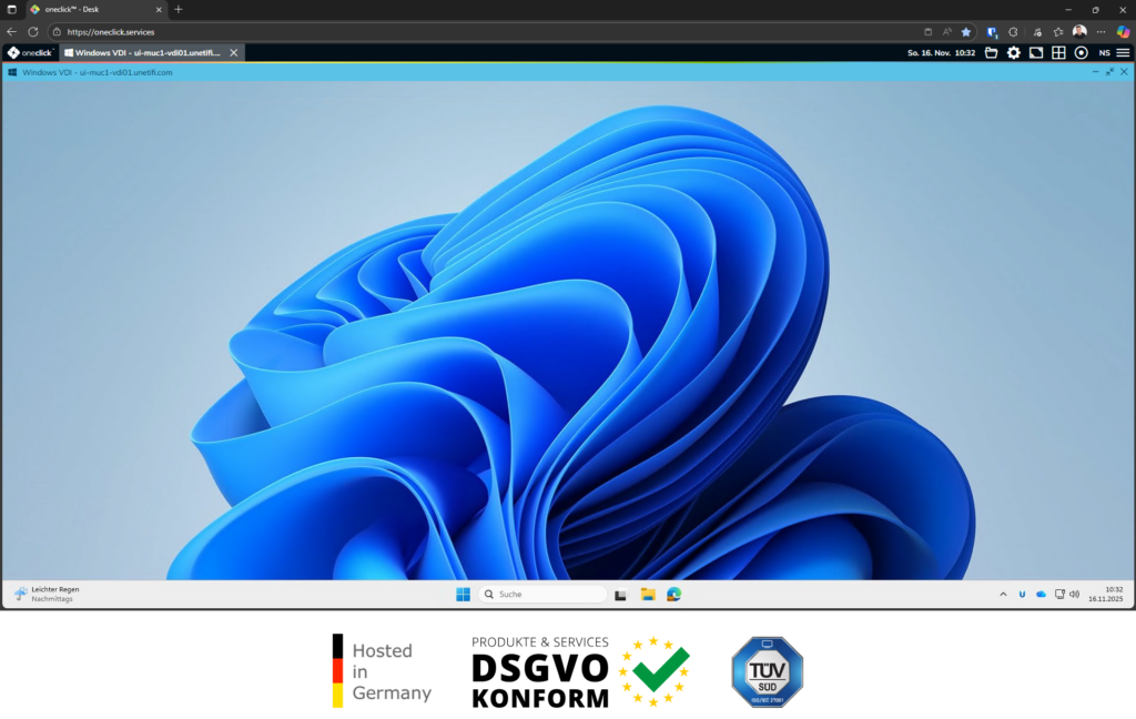 Mit unseren Managed-VDIs entfällt der klassische Aufwand, Mitarbeitern oder Freelancern erst Laptops zuschicken, einrichten oder zurückfordern zu müssen. Neue Teammitglieder erhalten innerhalb weniger Minuten einen komplett vorbereiteten, sicheren Windows-Desktop, der direkt im Browser oder per Client genutzt werden kann – egal ob im Büro, Homeoffice oder weltweit unterwegs.